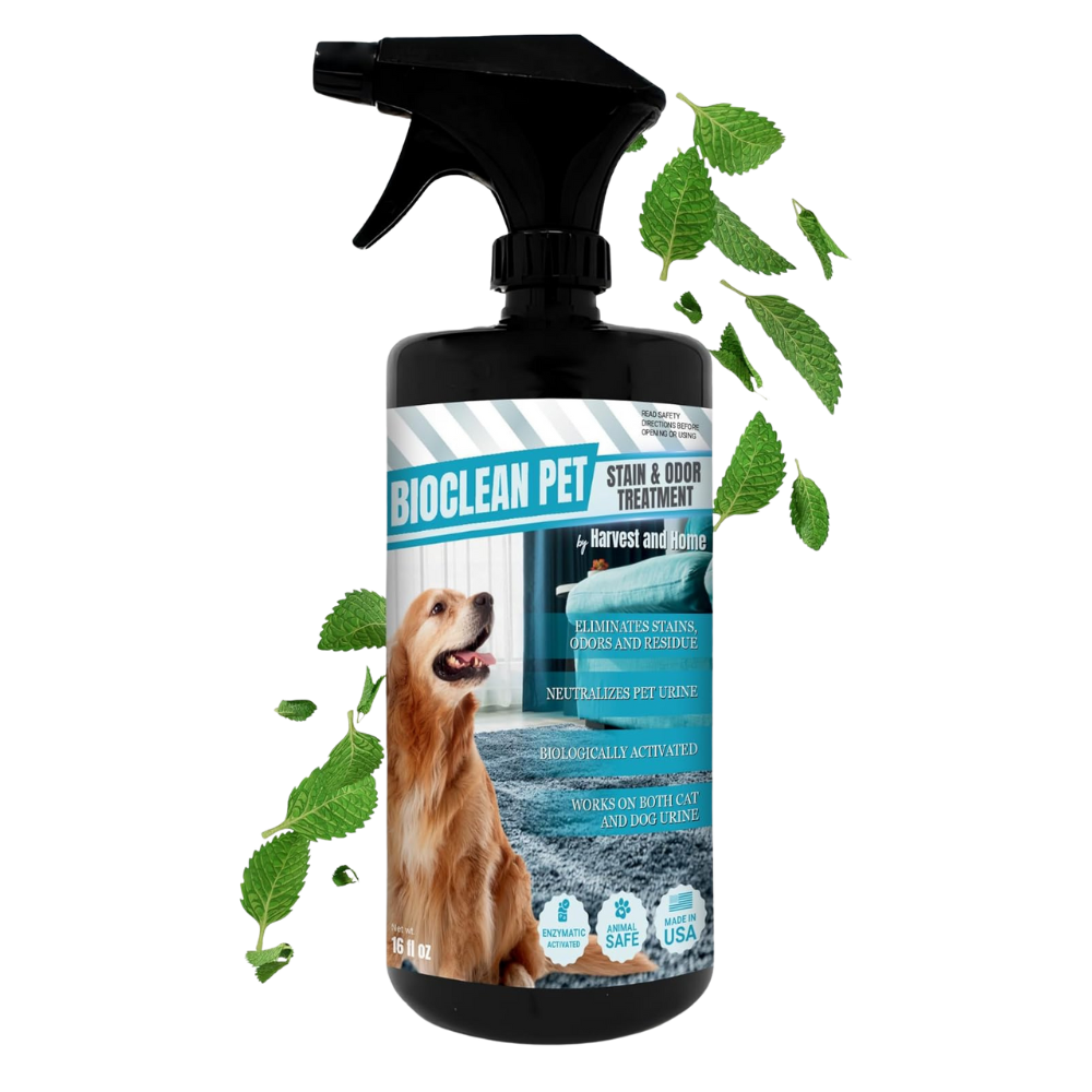 Bioclean Pet by Harvest and Home Carpet Cleaner - Stain and Odor Treatment spray is effective for stain and odor removal, preventing re-marking. It has a pleasant minty pine scent and is a good value for a natural enzyme cleaner.